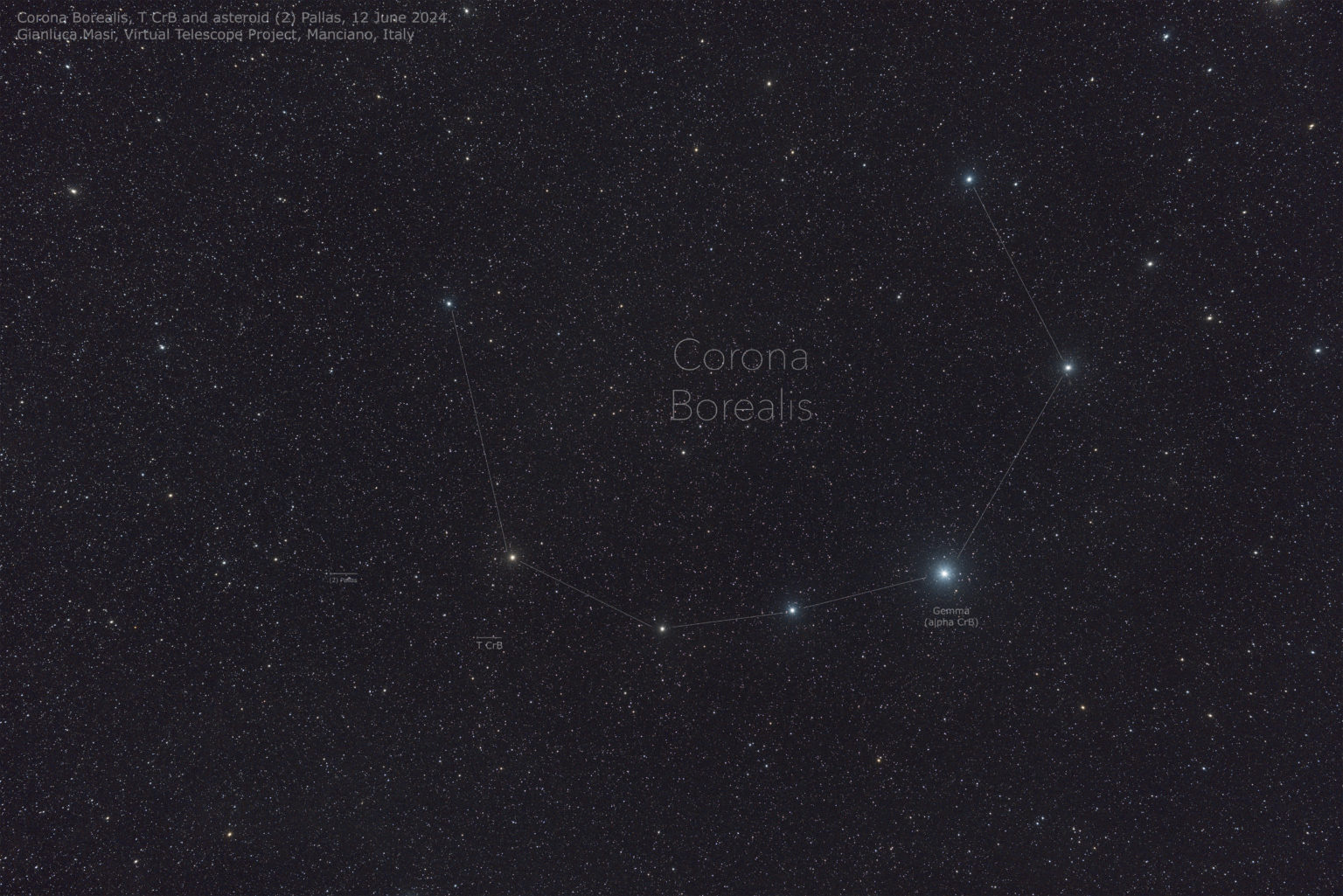 Coronae Borealis and the T CrB recurrent nova. 12 June 2024. The image above comes from the combination of 5, 120-second exposure, remotely taken with the Samyang 135+Paramount ME+ZWO ASI 6200MC Pro robotic unit available as part of the Virtual Telescope Project facility in Manciano, Italy.